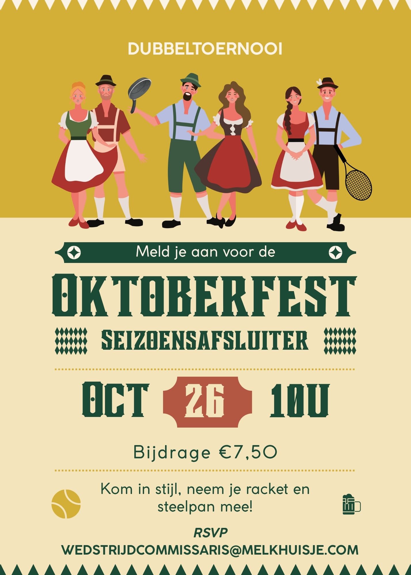 Om het einde van het Lustrum en het einde van het seizoen sportief af te sluiten, organiseren we zondag 26 oktober een Dubbeltoernooi in Oktoberfest stijl.